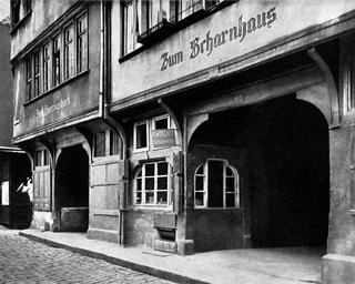 Keywords: Frankfurt Am Main-Scharnhaeuser-Bendergasse-EG Detail.jpg Frankfurt on the Main Late-gothic ground floors of the houses Bendergasse Coopers Lane No 11 and 13 also known as Scharnhaeuser Scharn Houses in the Altstadt Old Town Frankfurt am Main Spätgotische Erdgeschosse der als Scharnhäuser bekannten Gebäude Nr 11 und 13 in der Bendergasse der Altstadt Walter Sage Das Bürgerhaus in Frankfurt a M bis zum Ende des Dreißigjährigen Krieges Wasmuth Tübingen 1959 Das Deutsche Bürgerhaus 2 Creator Carl Andreas Abt around 1910 um 1910 PD-old Carl Andreas Abt Bendergasse Scharnhäuser 1910 in Frankfurt am Main 1910 |
