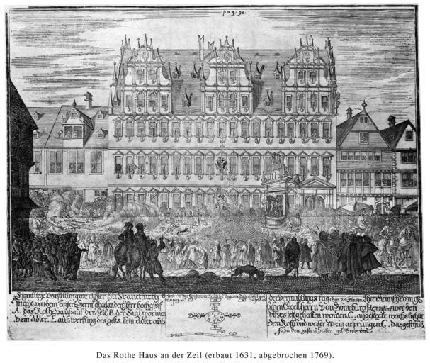 | Keywords: Frankfurt Am Main-Zeil-Rotes Haus-16990224.jpg  en Frankfurt on the Main Rotes Haus red house at the Zeil de Frankfurt am Main Rotes Haus auf der Zeil ein historisches Gasthaus Der wichtigste Großbau des 17 Jahrhunderts an der Zeil entstand ungefähr zwischen 1635 und 1640 mit dem Roten Haus etwas westlich von Klaus Bromms Haus Aufgrund spärlicher Quellenüberlieferung über das Vorhaben muss man sich an den wohl auf Erzählungen von Zeitzeugen fußenden Bericht des 1662 geborenen Stadtchronisten Achilles Augustus von Lersner halten der schrieb dass das Gebäude an Stelle von sechs mittelalterlichen Parzellen von einem Johann Porsch für über 32 000 Gulden errichtet wurde Es war der von seinen Formen her reinste Renaissancebau den es im biederen Frankfurt jemals gab das dreistöckige Gebäude verfügte über 19 Fensterachsen und wurde von drei gewaltigen nochmals dreigeschossigen Zwerchhäusern mit Pilastergliederung bekrönt Nach Norden verfügte es über eine ausgedehnte Gartenanlage die auf die Hinterhäuser der Kleinen Eschenheimer Gasse stieß Bemerkenswerter- weise handelte es sich um kein Privathaus sondern ein von vorneherein als luxuriöser Gasthof und Hotel konzipiertes Gebäude das dem Beherbergungswesen an der Zeil den endgültigen Durchbruch und Vorzug gegenüber der Altstadt brachte Es war zeitlang das sog erste Haus am Platz und verfügte über 50 beheizbare Zimmer einen großen Speisesaal und im hinteren Bereich Stallungen für ca 140 Pferde 1766 wurde das ROTE HAUS von seinem neuen Eigentümer Johann Adam Dick 1709-1797 abgerissen und durch einen spätbarocken Neubau ersetzt Der stand bis ca 1890 Nach dem Tod von Johann Adam Dick 1709-1797 wurde sein Schwiegersohn Samuel Friedrich Osterrieth 1762 “1821 Teilerbe durch den frühen Tod seiner ersten Ehefrau Johanna Rebecca Friederica Dick 1764-1799 Samuel Friedrich Osterrieth kam 1791 von Straßburg nach Frankfurt und brachte es hier zu Wohlstand und Ansehen Er handelte mit Häuten Fellen Rheinweinen und betrieb Wechselgeschäfte und eine Spedition Er brachte es bis zum Senior Präsident der damaligen žHandlungs-Kammer Seit 1799 war er in zweite Ehe verheirate mit Susanne Elisabeth d ™Orville 07 05 1770/72   09 09 1842 Tochter des Jean Georg d ™Orville Johann Georg d ™Orville 1747-1811 ´Im Alter von 58 Jahren ist er 1821 gestorben steht aber bis heute am Anfang der Osterrieths in Frankfurt Er wurde zum Ahnherrn einer weitverzweigten Familie d ™Orville verkaufte es an die Thurn und Taxis die dies Haus zu einer Poststation umbauten Später entstand hier das Reichs-Post- und Telegraphengebäudes an der Zeil mit Zufahrtsgleisen per Straßenbahn und Wendegléis im Hof Im Krieg zerstört dann Neubau nach dem Krieg einschließlich Fernmeldeamt Heute Standort von Immobilie MYZEIL Kaiserliche Ober-Postdirection Bearb Post und Telegraphie in Frankfurt am Main Denkschrift zur Einweihung des neuen Reichs-Post- und Telegraphengebäudes an der Zeil und des vom Frankfurter Handelsstande für dasselbe gestifteten Denkmals Kaiser Wilhelms I am 18 Oktober 1895 Verlag von August Osterrieth Frankfurt am Main 1895 en unknown engraver of the 17th century de unbekannter Kupferstecher des 17 Jahrhunderts 1699-02-24 PD-old-100 Rotes Haus auf der Zeil 1699 in Frankfurt am Main |