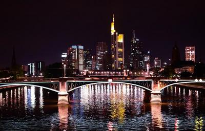 Keywords: frankfurt germany night reflection bridge main river skyline buildings architecture skyscrapers urban lights cityscape metropolitan view office panorama evening