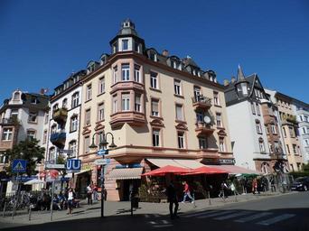 | Keywords: Frankfurt, Leipziger Straße 60.JPG de Frankfurt Leipziger Straße 62/Ecke Markgrafenstraße Mietshaus im Stil der Neorenaissance mit Putzfassade und archivoltierenden Fenstern teilweise durch Vorhangbogen ergänzt Muscheldekor im Bogenfeld Ein Erkertürmchen betont die Ecklage Ehemals Metzgerei Geibel mit Jugendstil-Dekor dann Schmuckwarenhandel Heute Gaststätte mit Freifläche Im ersten Stock ist noch ein historischer Anker für Stromversorgerung der ehemaligen Straßenbahn sichtbar 2012-09-03 own Karsten Ratzke de Images from Wiki Loves Monuments 2012 DE-HE cc-zero Uploaded with UploadWizard Cultural heritage monuments at Leipziger Straße Frankfurt am Main Built in Frankfurt am Main in 1900 |
