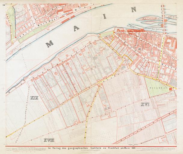 | Keywords: Frankfurt-Ravenstein1861-Bl8.jpg Ravenstein à bersicht Die neun Kartenblätter des vorgenannten Plans erschienen 1862 im Verlag des Geographischen Instituts zu Frankfurt am Main und sind der letzte große Plan der die Stadt noch völlig unberührt von den neuzeitlichen Straßendurchbrüchen darstellt; ausgenommen der Spindler-Plan von 1866 der jedoch nur fragmentarisch überliefert und somit unbrauchbar ist Was seinerzeit an Ravensteins Plan bemerkenswert war ist zum einen die Maßstabstreue die auf Grunlage eines mathematisch durchgerechneten Koordinatensystems erzielt wurde zum anderen die enorme Genauigkeit zeigt er doch jede einzelne Parzelle mit Hausnummer und benennt auch selbst kleinste Seitengassen Umso bemerkenswerter ist diese Leistung wenn man berücksichtigt dass der Plan noch größtenteils in Handarbeit und ohne moderne technische Hilfsmittel entstand Die Herstellung im chromolithograpischen Steindruckverfahren begründet zudem eine graphische Qualität die viele modernere Verfahren nie wieder erreicht haben Noch einige Worte zur Digitalisierung die heute bereits über 140 Jahre alten Pläne befanden sich zum Zeitpunkt der Digitalisierung August 2006 in einem bedauernswerten Zustand Die zeitgenössische Unsitte auf nicht säurefreiem Papier zu drucken hatte alle Blätter stark vergilben lassen eine unangemessene Lagerung der Pläne vermutlich während Kriegszeiten zu deren Schutz liess Feuchtigkeit in das Papier einziehen was wiederum zu Schimmelbildung in Form von teils starker Stockfleckigkeit führte Außerhalb industrieller Anwendungen fand sich weiter keine bezahlbare Möglichkeit der direkten Digitalsierung der etwas unter A2 großen Blätter Daher wurden diese jeweils in zwei Stücken mit einem A3-Scanner bei 600 DPI gescannt und anschließend mit einer für Fotopanoramen gedachten Software wieder zusammengefügt Anschließend erfolgten händische Retuschen aller Blätter ein digitales Entrauschen der sich aufgrund der hohen Auflösung zeigenden Papierstruktur und eine anschließende Farbkorrektur die einen Großteil der durch Vergilben verursachten Farbabweichungen beheben konnte Zuletzt wurden von den über 120 Megapixel großen Einzelblättern JPEGs mit 4000 Pixel Höhe gezogen da nur in dieser Auflösung eine Bildgröße um 5 MB gewährleistet ist; dies kann nur als Kompromiss gesehen werden da teilweise selbst bei Vollauflösung feinste Details wie Brunnen oder winzige Treppen in Hinterhöfen kaum erkennbar sind Bei Interesse an verlustlosen Originalen größeren Ausschnitten etc helfe ich http //de wikipedia org/wiki/Benutzer Doenertier82 natürlich jederzeit gerne aus Blatt 8 des Plans unten mittig Urheberrechtliche Ansprüche sind aufgrund des Alters erloschen PD-old August Ravensteins Geometrischer Plan von Frankfurt am Main C2 |