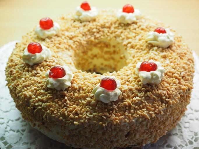 Keywords: frankfurt wreath cake pie specialty sandteig sponge wreath form buttercream filling candied cherries slip cherries brittle