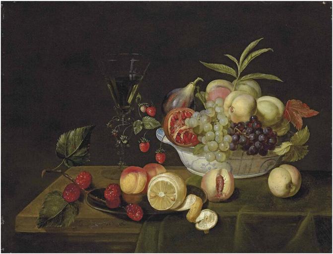 Keywords: Frans Ykens - Grapes, peaches, a fig and a passion fruit in a Wan-Li porcelain bowl.jpg Artwork Creator Frans Ykens en Grapes peaches a fig and a passion fruit in a Wan-Li porcelain bowl a half-peeled lemon on a pewter platter and a façon-de-Venise wine glass on a partly-draped wooden table 1615-1692 http //www christies com/lotfinder/paintings/frans-ykens-grapes-peaches-a-fig-and-5586311-details aspx Oil on copper size in 42 3 54 9 object history credit line signed 'fRanchois ÿkens fecit' lower left Auctioned at Christie's 4 July 2012 in London King Street lot 145 one of a pair accession number PD-old-100 DEFAULTSORT 3 Frans Ykens 17th-century still-life paintings 17th-century still life paintings of food |