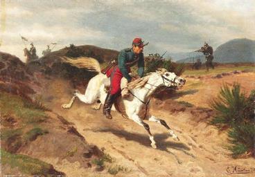 | Keywords: Franzoesischer-meldereiter.jpg Artwork Creator Emil Hünten 1872 Oil on canvas cm 23 5 46 object history sold 2003 at Van Ham credit line http //www van-ham com/datenbank-archiv/datenbank/emil-huenten/franzoesischer-meldereiter html PD-art-100 Uploaded with UploadWizard Paintings by Emil Hünten |