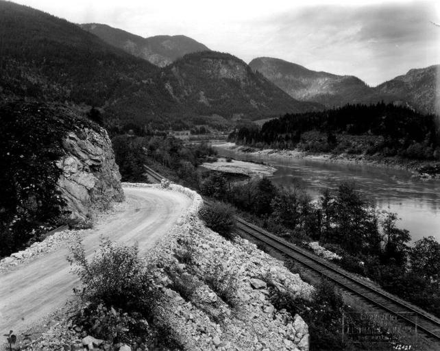 | Keywords: blackandwhite monochrome outdoor mountainside mountain landscape hill black and white "Fraser River & Valley: The scenic north shore Fraser road." Leonard Frank Photos, 553 Granville St., Vancouver, B.C. Photographers Association of America. Fraser Canyon Highway, Canadian Pacific Railway mainline and the Fraser River. View looking north from a point about 2 km south of Yale, BC. [Leonard Frank, photographer] "Fraser River & Valley: The scenic north shore Fraser road." Leonard Frank Photos, 553 Granville St., Vancouver, B.C. Photographers Association of America. Fraser Canyon Highway, Canadian Pacific Railway mainline and the Fraser River. View looking north from a point about 2 km south of Yale, BC. [Leonard Frank, photographer] |