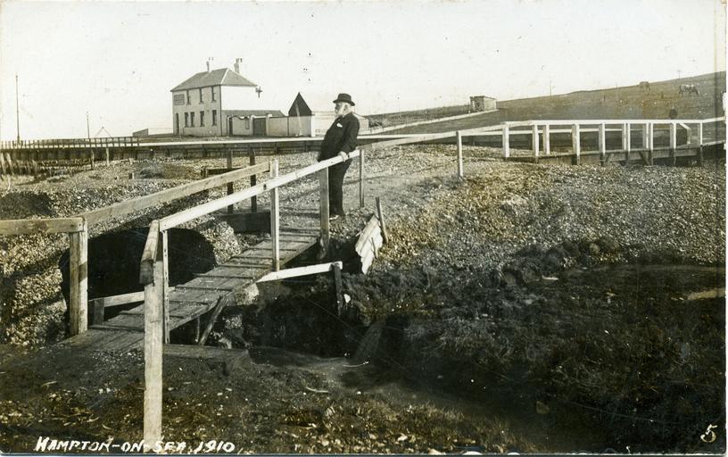 | Keywords: Fred C Palmer Edmund Reid on his bridge.jpg Postcard of Hampton-on-Sea Herne Bay Kent England dated 1910 showing Edmund Reid the police detective who investigated the Whitechapel murders Reid is standing on the bridge that he and a neighbour built over Westbrook; the council promptly said it was unsafe and demolished it In the background is the Hampton Inn on Hampton Pier Avenue ;Points of interest The cliff edge fronting Hampton-on-Sea has not yet eroded as far back as it is today Reid has put on his best clothes for the photograph The bridge cannot have existed for more than a few days or weeks so Palmer was possibly called in for the photograph almost immediately after it was built Next to the Hampton Inn animals graze where now there are houses The hut at the end of the pub garden is probably the lavatory block The postcard may have once been tinted but if so the colour has almost completely faded Scan of postcard circa 1910 Palmer took similar pictures of the same site in that year Fred C Palmer d 1941 out of copyright Other views of the same subject are File Hampton-on-Sea 1910 023 jpg and File Hampton on Sea 1911 125 jpg PD-art Erosion in the United Kingdom Disasters Buildings in Kent Edmund Reid |