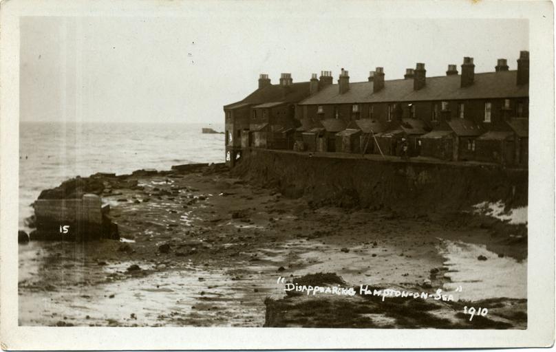 Keywords: Fred C Palmer Hernecliffe Gardens Hampton-on-Sea 011.jpg Postcard dated 1910 showing the back of Hernecliffe Gardens terrace in the process of sea erosion Photographed looking north-east from the shore at Hampton-on-Sea Herne Bay Kent England Border The remaining border of this image is important for researchers of this photographer Some photographers trimmed their images more than others and Palmer has a reputation for producing smaller postcards than other early 20th century UK photographers He took his own photos developed them in-house onto postcard-backed photographic paper and trimmed them himself It is worth adding that during hand-developing the border is actively masked with equipment which both crops the picture and causes the white frame or border to appear on the paper This frame is part of the design and is one of the reasons why the quality of Palmer's work is so interesting and why there is an article and category for him on English Wiki Researchers need to see exactly where the edge of the postcard is This postcard has no white frame but the edge of the card is the edge of the composition Thank you for taking the time to read this ;Points of interest The end of the old derelict Hampton Pier can be seen behind the houses The terrace is derelict and about to be demolished Scan of postcard 1910 Fred C Palmer d 1941 out of copyright Other views of the same subject are File Hampton-on-Sea 1910 023 jpg and File Hampton on Sea 1911 125 jpg PD-old-70-1923 Hampton-on-Sea Erosion in the United Kingdom Disasters Buildings in Kent Fred C Palmer of Herne Bay |