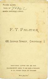 Keywords: FredTPalmer005a.jpg Reverse of 19th century carte de visite photo of baby aged nine months to one year by Fred T Palmer of 68 George Street Croydon Surrey England The card is undated but the costume is possibly 1870s-1900 ;Points of interest It is not possible to tell whether the child is a boy or girl as they were dressed alike during that period The child's right foot has the big toe in an unusual position; this may or may not indicate that the child had difficulty in walking and in putting on shoes Scan of original card s 1870 -1900 Fred T Palmer of Ramsgate d 1910 out of copyright The front of this carte de visite is here File Fred T Palmer 005 jpg PD-old-70-1923 Fred T Palmer of Ramsgate Cartes de visite 19th-century portrait photographs |