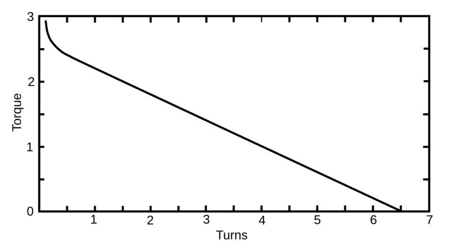 Keywords: Free mainspring torque curve.svg Hooke's Law the torque exerted by the spring decreases linearly to zero as it unwinds At the left side where the spring approaches full wind all the slack is gone from between the turns and they are pressed tight together so the torque increases Own Chetvorno 2008-09-20 I the author Chetvorno Chris Burks release this work into the public domain for any use whatever Mainspring |