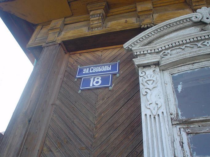 Keywords: Freedom-st-table.JPG en Address plaque on the house Svobody street Chelyabinsk Russia ru Ад есная табличка на доме ул Свободы Челябинск Данный дом подготовлен к сносу находится в исто ической части улицы Ап ель 2010 own it's my own work Andreasstolz 2010-04-08 Buildings in Chelyabinsk House numbers in Russia Wooden architecture in Chelyabinsk Oblast Freedom streets 18 house number