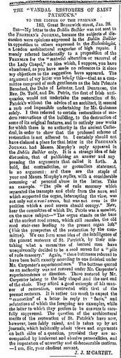 Keywords: Freeman's Journal 30 January 1863 Letter by J. J. McCarthy.png Letter to the editor by J J McCarthy which appeared in the issue of Freeman's Journal on 30 January 1863 p 4 Scan downloaded from the collection British Newspapers 1600 “1900 of Gale 1863-01-30 J J McCarthy Transcription THE VANDAL RESTORERS OF SAINT PATRICK'S <center><small>TO THE EDITOR OF THE FREEMAN</small></center> 183 Great Brunswick-street Jan 28 Sir ”My letter to the Dublin Builder was not sent to the Freeman's Journal because the subjects of discussion were opinions expressed in the Ecclesiologist a London architectural magazine of high repute I merely referred incidentally to a proposition of the Freeman for the material alteration or removal of the Lady Chapel an idea which I suppose you have abandoned as you have made no reference to it since my objections to the suggestion have appeared The argument of my letter was briefly this ”that as a committee composed of such gentlemen as the late Primate Beresford the Duke of Leinster Lord Dunraven the Rev Dr Todd and Dr Petrie the first of Irish antiquaries would not undertake the restoration of St Patrick's without the advice of an architect it seemed a rash and impossible undertaking for Mr Guinness solely I then referred to certain restorations of modern renovations of the building to the destruction of some of its original features and to entirely new works for which there is no authority in the ancient Cathedral in order to show that the professed scheme of restoration is not adhered to I certainly should not have claimed a place for that letter in the Freeman's Journal had Messrs Murphy's reply appeared in the Dublin Builder only It is a strange idea of fair discussion that of publishing an answer and suppressing the arguments that called it forth A bold flat contradiction or groundless statement is no argument; and these are the staple of your and Messrs Murphy's replies with a considerable seasoning of personal abuse in the latter Take an example The pile of rude masonry which separated the transepts and choir from the nave and which supported the organ intercepting the view was not only not a rood screen but was not even in the position which a rood screen should occupy Now hear the committee of which Dr Petrie was a member on the same subject ” The organ stands on the base of the ancient rood screen which still remains the old rood stair case leading to the present organ loft Vide the prospectus of the restoration by the committee We can form some idea of the intelligence of the present restorers of St Patrick's by their mistaking what a committee of learned men have unequivocally decided to be a rood screen for a pile of rude masonry Again these buttresses referred to have been built exactly according to one finished under Mr Carpenter's superintendence The buttress quoted as an authority was not restored under Mr Carpenter's superintendence or direction Those restored by Mr Carpenter belong to the lady chapel and the east end of the choir They afford a good example of his manner of restoration constrasted with that of the present restorers It is rather too much to expect the concoction of a letter in reply to facts and refutations of which the foregoing are examples while the letter to which they profess to be answers is carefully suppressed The question of the architectural merits of the restoration of St Patrick's have now however been fairly raised and is taken up by art journals which habitually admit views and arguments on both sides of a question provided they are accompanied by irrelevant and abusive personalities and the imputation of unworthy and dishonourable motives <br/> ”I am Sir your obedient servant <br/>J J M ˜CARTHY PD-old-100 J J McCarthy Restoration of St Patrick's Cathedral Dublin 1860 “1865 1863 newspapers Letters to the editor |