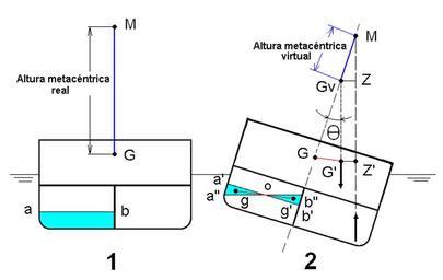 Keywords: FreeSurfaceEfect.PNG ES Esquema de efecto de superficie libre en la estabilidad del buque EN free surface efect on ship's stability Own 2007-03 Claudio Elias Ship stability