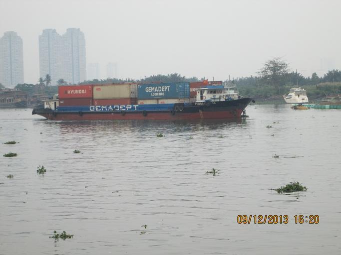 Keywords: Freight barges on the 'Saigon River'.JPG en A barge transporting container cargo on the Saigon river own Rudolph A Furtado Monday 9-12-2013 Transport in Ho Chi Minh City Cc-zero