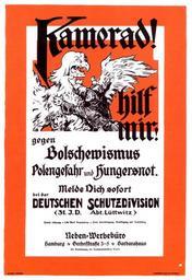 Keywords: Freikorpsplakat (1919).JPG de H Wissmann Werbeplakat der deutschen Freikorps Berlin 1919 Text Kamerad Hilf mir gegen Bolschewismus Polengefahr und Hungersnot Melde Dich sofort bei der DEUTSCHEN SCHUTZDIVISION 31 J D Abt Lüttwitz Mobile Löhnung 5 00 Mark Tageszulage Freie Unterbringung Verpflegung und Ausrüstung 90 0 x 60 0 cm ru Х Виссманн Агитационный плакат ге манского доб овольческо го ко пуса Бе лин 1919 Текст Това ищи Помогите мне П отив большевизма польской опасности и голода Записывайся не медля в дивизию ополчения 31-я еге ская дивизия отд Люттвиц Жалованье в зависимости от звания Ежедневная п ибавка 5 00 ма ок Бесплатные ночлег питание и сня яжение 90 0 х 60 0 см Einst und Jetzt bd 31 1986 S 51 genehmigt vom Reichswehrministerium Freikorps Weimar Republic Posters PD-old |