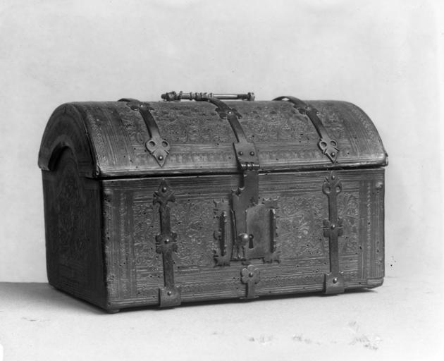 Keywords: French - Coffret and Key - Walters 7312.jpg Coffrets or small boxes covered with leather were often used to store documents or other desk objects It is decorated with floral patterns and includes two inscriptions on the right J'ay bien choisi I have chosen well ; and on the left Son voulloir est le myen His will is my will The box was originally painted with red and blue against a natural leather background and had gilt details ca 1425 1450 Late Medieval wood paint and gilt on leather wrought iron with hinges cm 18 28 8 18 4 accession number 73 12 26415 Henry Walters Baltimore date and mode of acquisition unknown Walters Art Museum Henry Walters Acquired by Henry Walters The International Style The Arts in Europe Around 1400 The Walters Art Gallery Baltimore 1962 place of origin France Walters Art Museum license Caskets furniture Medieval art in the Walters Art Museum Renaissance applied arts in the Walters Art Museum Art of France in the Walters Art Museum Media contributed by the Walters Art Museum needs category review |