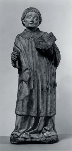 Keywords: French - Deacon Holding a Book - Walters 27437.jpg This deacon identified by his collar and tunic from the order of clergy just below the priest holds an open Gospel book from which he would have read aloud during mass The statue may represent the deacon Eleutherius companion of St Denis; they were martyred together near Paris about 275 We cannot make out the shape of his body under the heavy cloth-as one might in an Italian statue-but the swaying lines of the folds and the tilt of the man's head indicate that his weight is on his left leg a graceful natural stance This is complemented by realistic details such as his bare toes Originally the statue was painted enhancing the naturalistic impression between 1440 1470 limestone with traces of paint cm 75 26 19 5 accession number 27 437 8097 Henry Walters Baltimore date and mode of acquisition unknown Walters Art Museum Henry Walters Acquired by Henry Walters Religious Art of the Western World Dallas Museum of Art Dallas 1958 Illuminated Manuscripts Masterpieces in Miniature The Walters Art Gallery Baltimore 1984-1985 place of origin France Walters Art Museum license Renaissance sculpture in the Walters Art Museum Art of France in the Walters Art Museum Media contributed by the Walters Art Museum needs category review |
