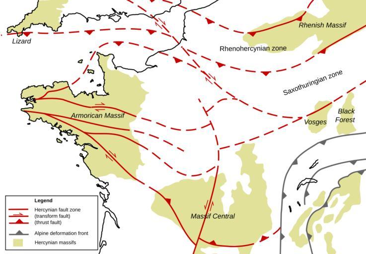 | Keywords: French Hercynian massifs EN.svg Service Géologique National ; 1996 Carte géologique de la France au millionième Éditions BRGM 6<sup>th</sup> ed Paris Debelmas J ; 1974 Géologie de la France 1 vieux massifs et grands bassins sédimentaires Doin éditeurs Paris ISBN 2-7040-0011-5 Martínez-Catalán J R ; 1990 A non-cylindrical model for the northwest Iberian allochthonous terranes and their equivalents in the Hercynian belt of Western Europe Tectonophysics 179 pp 253-272 Matte Ph ; Maluski H ; Rajlich P Franke P ; 1990 Terrane boundaries in the Bohemian Massif Result of large-scale Variscan shearing Tectonophysics 177 pp 151-170 Pharaoh T C ; 1999 Palaeozoic terranes and their lithospheric boundaries within the Trans-European Suture Zone TESZ a review Tectonophysics 314 pp 17-41 own Woudloper 2008-11 Variscan orogeny Geological maps of the Netherlands Geological maps of Belgium Geological maps of France Geological maps of Germany SVG geology Structural geology maps SVG maps in English Geological maps of Switzerland Geological maps of England |