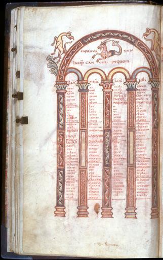 | Keywords: French - Leaf from Gospels - Walters W316V - Open Reverse.jpg Frence late Other date century 10 Medieval ink paint parchment cm 31 18 accession number W 3 16V 15740 Abbey Saint-Benoit-sur-Loîre Fleury late 10th century Léon Gruel Paris prior to 1903 mode of acquisition unknown Henry Walters city Baltimore Walters Art Museum Henry Walters Acquired by Henry Walters 1903 Illuminating the Word Gospel Books in the Middle Ages The Walters Art Museum Baltimore 2004 place of origin Fleury France Walters Art Museum license 2D Walters MS W3 - Gospels Canon tables Capricorn astrology |
