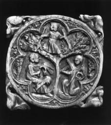 | Keywords: French - Mirror Case with the God of Love - Walters 71265.jpg The God of Love crowned and winged stands in a tree and throws arrows on the two lovers below The seated man is shown with a hawk and the kneeling woman already struck by an arrow holds a chaplet in her hand for her beloved The scene has a seven-lobed frame with masks in the spandrels Four monsters form the corner terminals The mirror is considerably worn from use middle Other date century 14 Medieval ivory cm 9 5 9 5 accession number 71 265 35131 Count Dimitri Stroganoff Collection Rome date and mode of acquisition unknown Elia Volpi Florence date and mode of acquisition unknown Volpi Sale New York November 21 1916 lot 1 H Wareham Harding New York date and mode of acquisition unknown Henry Walters city Baltimore Walters Art Museum Henry Walters Acquired by Henry Walters 1916 The Medieval Garden Spencer Museum of Art Lawrence; Dumbarton Oaks Washington 1983 place of origin France Walters Art Museum license French carved ivory mirror cases in the Walters Art Museum 14th-century carved ivory mirror cases Stroganoff collection of Western art |
