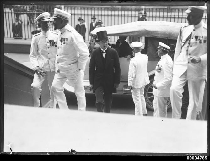 | Keywords: samuel j hood collection samueljhoodcollection hood hood collection hoodcollection naval navy officers naval officers navalofficers sydney parliament house parliamenthouse officials french french navy frenchnavy macquarie street' street naval personnel navalpersonnel victor hugo victorhugo jules michelet julesmichelet captain favereau captainfavereau captain lequerre captainlequerre captain ferret captainferret rear admiral gilly rearadmiralgilly blackandwhite monochrome photo border black and white This photograph depicts French naval officers at a luncheon reception which was held at Parliament House in Macquarie Street, Sydney on 5 January 1923. The man second from the left is Frigate Captain Ferret of JULES MICHELET, and the two men second and third from the right facing the motor vehicle is Ship-of-the-Line Captain Favereau of JULES MICHELET and Ship-of-the-Line Captain Lequerre of VICTOR HUGO. This photo is part of the Australian National Maritime Museum’s Samuel J. Hood Studio collection. Sam Hood (1872-1953) was a Sydney photographer with a passion for ships. His 60-year career spanned the romantic age of sail and two world wars. The photos in the collection were taken mainly in Sydney and Newcastle during the first half of the 20th century. The ANMM undertakes research and accepts public comments that enhance the information we hold about images in our collection. This record has been updated accordingly. Photographer: Samuel J. Hood Studio Collection Object no. 00034785 This photograph depicts French naval officers at a luncheon reception which was held at Parliament House in Macquarie Street, Sydney on 5 January 1923. The man second from the left is Frigate Captain Ferret of JULES MICHELET, and the two men second and third from the right facing the motor vehicle is Ship-of-the-Line Captain Favereau of JULES MICHELET and Ship-of-the-Line Captain Lequerre of VICTOR HUGO. This photo is part of the Australian National Maritime Museum’s Samuel J. Hood Studio collection. Sam Hood (1872-1953) was a Sydney photographer with a passion for ships. His 60-year career spanned the romantic age of sail and two world wars. The photos in the collection were taken mainly in Sydney and Newcastle during the first half of the 20th century. The ANMM undertakes research and accepts public comments that enhance the information we hold about images in our collection. This record has been updated accordingly. Photographer: Samuel J. Hood Studio Collection Object no. 00034785 |
