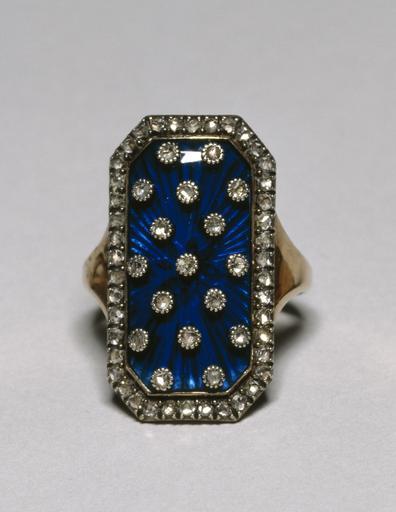 | Keywords: French - Ring with Celestial Motif - Walters 571792 - Top.jpg In the late 18th century and into the 19th century marquise rings set with diamonds on dark blue or red enamel backgrounds became fashionable in Europe The oval marquise bezel like this ring and the rectangular shuttle-shaped bezel were the most popular shapes with diamonds set to imitate stars in the sky or floral sprays It was charactersitic to frame these rings with a border of diamond sparks set in silver mounts The blue enameled rings evoke celestial allusions; rings of this kind were called bagues au firmament Rings of the Heavens late Other date century 18 gold silver enamel diamonds bezel cm 2 7 ; hoop cm 1 75 diam accession number 57 1792 4706 Unknown collection no 38 Henry Walters Baltimore 1922 mode of acquisition unknown Laura F Delano New York date of acquisition unknown by gift Walters Art Museum June 9 1947 by gift Gift of Laura F Delano 1947 Jewelry - Ancient to Modern The Walters Art Gallery Baltimore 1979-1980 Bedazzled 5 000 Years of Jewelry from the Walters Art Museum Frist Center for the Visual Arts Nashville; The John and Mable Ringling Museum of Art Sarasota; The Walters Art Museum Baltimore 2006-2009 Bedazzled 5 000 Years of Jewelry El Paso Museum of Art El Paso 2010 place of origin France Walters Art Museum license Jewellery in the Walters Art Museum Art of France in the Walters Art Museum Media contributed by the Walters Art Museum needs category review |