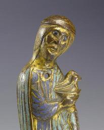 | Keywords: French - Saint Joseph - Walters 44257 - Detail A.jpg This figure holding two doves can be identified as St Joseph bringing an offering on the occasion of the Presentation of Christ to the temple The figure was attached to a plaque by means of rivets one at the neck and one between the legs Relief figures such as this were commonly applied to enliven the surface of Limoges works such as devotional diptychs and reliquary shrines some examples of which are on view in the Romanesque and Gothic Art gallery ca 1250 gilded copper champlevé enamel cm 19 21 5 08 2 38 accession number 44 257 31733 Henry Walters Baltimore date and mode of acquisition unknown Walters Art Museum Henry Walters Acquired by Henry Walters place of origin Limoges France Walters Art Museum license Medieval metalwork in the Walters Art Museum Champlevé of Europe Media contributed by the Walters Art Museum needs category review Doves in Christian art |
