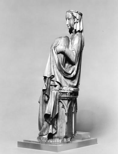Keywords: French - Virgin and Child - Walters 71243 - Left.jpg The seated figure of the Virgin arches gently backward to conform to the curve of the ivory tusk The Christ Child stands in her lap with one foot on the throne and reaches for the stem of lilies that were held in the Virgin's right hand The group is carved in the round The throne is decorated with thin colonnettes supporting pointed arches and there is a band of rosettes on the molding of the seat Traces of blue pigment remain on the skirt painted over a reddish stain and the silhouettes of gilt embroidery patterns occur on the borders The Virgin's crown and right arm are missing The Child's head his left hand and part of his right hand are missing A wedge of ivory at the base which established the proper position of the group is missing and there are two major chips along the base The right half of the Virgin's face was restored in the 19th century between 1320 1340 Medieval ivory cm 27 5 accession number 71 243 3053 M Godfroy Brauer Nice Henri Daguerre Paris date and mode of acquisition unknown Henry Walters city Baltimore Walters Art Museum Henry Walters Acquired by Henry Walters 1930 place of origin Paris France Walters Art Museum license Medieval ivory in the Walters Art Museum Art of France in the Walters Art Museum Media contributed by the Walters Art Museum needs category review Sculptures of Madonna and Child |