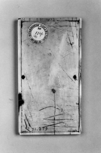 | Keywords: French - Wax Tablet with the Prodigal Son - Walters 71279 - Back.jpg The plaque illustrates the first two scenes of the story of the Prodigal Son and should be read from bottom to top In the first scene the father divides his inheritance as the Prodigal who is shown in an elegant hat is observed by his mother and brother Above the Prodigal rides with his hawk followed by a servant with a chest full of treasure As they approach a young woman the servant raises a warning finger The scenes are set beneath canopies of trefoil arches There are two holes drilled in the center at the sides for cords to attach the leaf to others The back is recessed to receive a coat of wax for writing between 1330 1350 Medieval ivory cm 11 6 6 3 accession number 71 279 22769 Fictile cast in the Victoria and Albert Museum 1873-165 Max and Maurice Rosenheim London date and mode of acquisition unknown Rosenheim Sale Sotheby's London May 9-11 1923 lot 294 William T / Henry Walters Collection Baltimore date of acquisition unknown by purchase Walters Art Museum Henry Walters Acquired by William T or Henry Walters The International Style The Arts in Europe Around 1400 The Walters Art Gallery Baltimore 1962 place of origin Paris France Walters Art Museum license Medieval ivory in the Walters Art Museum Art of France in the Walters Art Museum Media contributed by the Walters Art Museum needs category review |