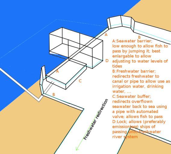 | Keywords: Freshwater river redirection.png en A schematic showing how a river can be redirected so that the water may be used for drinking water irrigation The schematic was made based on a plan to divert the murray river inland and break the connection with the sea It was reported that besides giving a supply of already fairly pure freshwater other benefits exist too such as the halting of the salination of rivers In addition it might allow to control pollution of the river as it becomes a greater asset to villagers and also implement additional pollution control regarding pollution from ships Note a second seawater buffer box should have actually been placed after the lock aswell but this was not done in order to increase clarity of the system own KVDP 2009-11-04 technology When a rediversion of a river such as described here is done it may also be useful to change the marking buoy system At present the IALA-A system for example adheres to a different color pattern than what is usual red for left side green for right when facing the river mouth It may be advisable to change navigation lights and markings to red for right green for left and extent this troughout the entire system and make sure the red buoys are placed on the right side and the green buoys are placed on the left side when facing the river coming from the sea Ichthyology Hydraulics Marine engineering Hydropower schemas and diagrams |