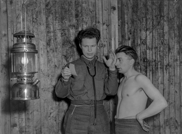 | Keywords: andre verdenskrig andreverdenskrig vårslipp 2015 vårslipp2015 frigjøring 2. verdenskrig 2verdenskrig kirkenes finnmark norge blackandwhite people monochrome black and white Original bildetekst: Allerede de første dagene etter befrielsen av Kirkenes meldte omlag 1.500 nordmenn seg som frivillige til de norske styrkene. Under ledelse av norske offiserer tok de straks opp trening og vaktarbeide i de befriede områder. Bildet er tatt under legeundersøkelsen, som foregår i en forhenværende tysk brakke under ytterst primitive forhold. En stor petroleumslampe er den eneste lyskilde, trengs mer må lommeløkta tas i bruk. Fotograf: Ole Friele Backer Arkivreferanse: NTBs krigsarkiv i Riksarkivet (RA/PA-1209/U/Uj/L0214) Original bildetekst: Allerede de første dagene etter befrielsen av Kirkenes meldte omlag 1.500 nordmenn seg som frivillige til de norske styrkene. Under ledelse av norske offiserer tok de straks opp trening og vaktarbeide i de befriede områder. Bildet er tatt under legeundersøkelsen, som foregår i en forhenværende tysk brakke under ytterst primitive forhold. En stor petroleumslampe er den eneste lyskilde, trengs mer må lommeløkta tas i bruk. Fotograf: Ole Friele Backer Arkivreferanse: NTBs krigsarkiv i Riksarkivet (RA/PA-1209/U/Uj/L0214) |