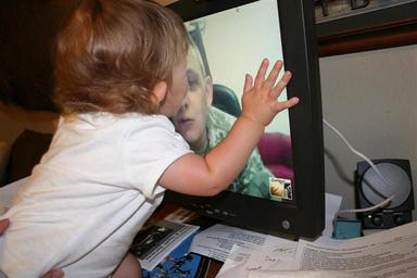 Keywords: Frocking becomes Family affair DVIDS108885.jpg en Lt Col Nathan Blood brigade effects coordinator for 4th Brigade Combat Team 10th Mountain Division Light Multi-National Division “ Baghdad and his 16-month-old daughter Mackenzie kiss computer images of one another during a web camera communication Blood kissed Mackenzie from the forward operating base and she kissed her dad from Fort Polk La 2008-08-16 Sgt 1st Class Matthew Meadows https //www dvidshub net/image/108885 108885 2008-08-16 09 44 FORWARD OPERATING BASE LOYALTY IQ PD-USGov Fort Polk Images from DoD uploaded by Fæ |