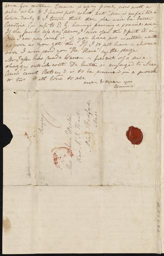 Keywords: From Anne Warren Weston to Deborah Weston; Sunday, January 1, 1837 p4.jpg Page p 4 Call Number Ms A 9 2 v 9 n 2 Format Autograph Letter Signed Extent 4 p 12 x 7 1/2 in Creator Weston Anne Warren 1812-1890 Date of creation 1837-01-01 Place of creation Boston MA Recipient Weston Deborah 1814-1889 Place of receipt New Bedford MA BPL department Rare Books Transcription here for certain Emma is very poorly now with a side ache I know not what but Ma is expected in town daily I trust that then she will be better Caroline is up to E G Loring ™s passing a social evening If she picks up any news I will open this put it in All I can say more is if you have not written write as soon as you get this If I do not have a chance soon I will send you the Slave by the stage Mr Tyler has made Warren a present of a nice shaggy outside coat Dr Cutter is engaged to Mary Ann ™s Aunt Betsey is to be promised in a month or two With love to all Ever ever yrs Anne Single Miss Debora Weston Rev N J Bent New Bedford Mass Flickr data on 2011-08-02 Camera Sinar AG Sinarback 54 FW Sinar m Tags dc identifier 08_07_000008 License CC BY 2 0 User Boston Public Library BPL Flickr http //flickr com/photos/24029425 N06/2653130304 From Anne Warren Weston to Deborah Weston; Sunday January 1 1837 2008-07-08 15 38 32 creator Anne Warren Weston PD-old-100 User Flickr upload bot/upload 23 36 2 August 2011 UTC Fæ CC BY 2 0 Anne Warren Weston anti-slavery letters Photos uploaded from Flickr by Fæ using a script Taken with Sinarback 54 |