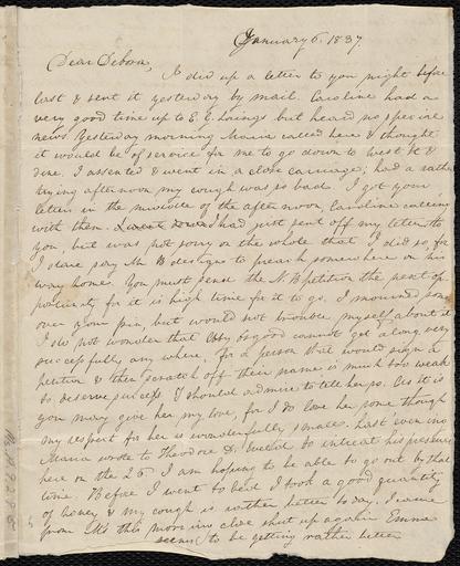 Keywords: From Anne Warren Weston to Deborah Weston; Friday, January 6, 1837 p1.jpg Page p 1 Call Number Ms A 9 2 v 9 n 5 Format Autograph Letter Signed Extent 4 p 8 1/8 x 6 1/2 in Creator Weston Anne Warren 1812-1890 Date of creation 1837-01-06 Place of creation Boston MA Recipient Weston Deborah 1814-1889 Place of receipt New Bedford MA BPL department Rare Books Transcription January 6 1837 Dear Debora I did up a letter to you might before last sent it yesterday by mail Caroline had a very good time up to E G Lorings but heard no special news Yesterday morning Maria called here thought it would be of service for me to go down to West St dine I assented went in a close carriage; had a rather trying afternoon my cough was so bad I got your letter in the middle of the afternoon Caroline calling with them I went down I had just sent off my letter to you but was not sorry on the whole that I did so for I dare say Mr B designs to preach somewhere on his way home You must send the N B petition the next opportunity for it is high time for it to go I mourned some over your pin but would not trouble myself about it I do not wonder that Abby Osgood cannot get along very successfully anywhere for a person that would sign a petition then scratch off their name is much too weak to deserve success I should admire to tell her so As it is you may give her my love for I do love her some though my respect for her is wonderfully small Last evening Maria wrote to Theodore D Weld to intreat his presence here on the 25 I am hoping to be able to go out by that time Before I went to bed I took a good quantity of honey my cough is rather better today I came from M ™s this morning close shut up again Emma seems to be getter rather better Flickr data on 2011-08-02 Camera Sinar AG Sinarback 54 FW Sinar m Tags dc identifier 08_07_000009 License CC BY 2 0 User Boston Public Library BPL Flickr http //flickr com/photos/24029425 N06/2652304609 From Anne Warren Weston to Deborah Weston; Friday January 6 1837 2008-07-08 15 38 36 creator Anne Warren Weston PD-old-100 User Flickr upload bot/upload 23 37 2 August 2011 UTC Fæ CC BY 2 0 Anne Warren Weston anti-slavery letters Photos uploaded from Flickr by Fæ using a script |