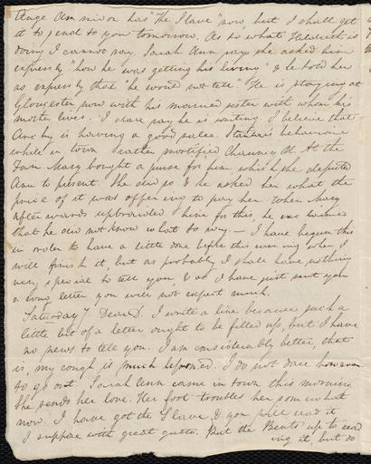 Keywords: From Anne Warren Weston to Deborah Weston; Friday, January 6, 1837 p2.jpg Page p 2 Call Number Ms A 9 2 v 9 n 5 Format Autograph Letter Signed Extent 4 p 8 1/8 x 6 1/2 in Creator Weston Anne Warren 1812-1890 Date of creation 1837-01-06 Place of creation Boston MA Recipient Weston Deborah 1814-1889 Place of receipt New Bedford MA BPL department Rare Books Transcription Ange Ammidon has The Slave now but I shall get it to send to you tomorrow As to what Hildreth is doing I cannot say Sarah Ann says she asked him expressly how he was getting his living he told her as expressly that he would not tell He is staying at Gloucester now with his married sister with whom his mother lives I dare say he is writing I believe that Archy is having a good sales Stanton ™s behavior while in town rather mortified Chauncy Pl At the Fair Mary bought a purse for him which she deputed Ann to present She did so he asked her what the price of it was offering to pay her When Mary afterwards upbraided him for this he exclaimed that he did not know what to say “ I have begun this in order to have a little done before this evening when I will finish it but as probably I shall have nothing very special to tell you as I have just sent you a long letter you will not expect much Saturday 7 Dear D I write a line because such a little bit of a letter ought to be filled up but I have no news to tell you I am considerably better that is my cough is much lessened I do not dare however to go out Sarah Ann came in town this morning She sends her love Her foot troubles her somewhat now I have got the Slave you will read it I suppose with great gusto Put the Bents up to reading it but do Flickr data on 2011-08-02 Camera Sinar AG Sinarback 54 FW Sinar m Tags dc identifier 08_07_000010 License CC BY 2 0 User Boston Public Library BPL Flickr http //flickr com/photos/24029425 N06/2653130846 From Anne Warren Weston to Deborah Weston; Friday January 6 1837 2008-07-08 15 38 41 creator Anne Warren Weston PD-old-100 User Flickr upload bot/upload 23 38 2 August 2011 UTC Fæ CC BY 2 0 Anne Warren Weston anti-slavery letters Photos uploaded from Flickr by Fæ using a script Taken with Sinarback 54 |