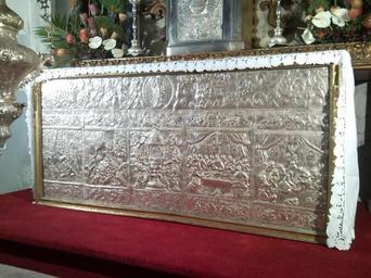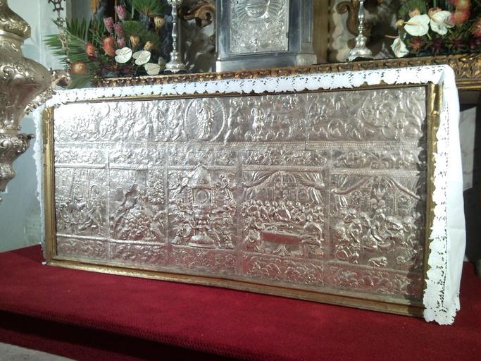 Keywords: Frontal de prata do altar do Santíssimo Sacramento com iconografia eucarística do século XVIII, Tesouro da Sé de Angra do Heroísmo. Dimensões 140x90 cm..jpg en Front panel of the main alter 140 x 90 cm with eucharistic iconography from the 18th century Sé Cathedral Sé Angra do Heroísmo Terceira Azores Portugal pt Frontal de prata do altar do Santíssimo Sacramento com iconografia eucarística do século XVIII Tesouro da Sé de Angra do Heroísmo dimensões 140x90 cm Own 10/12/2008 José Luís Ávila Silveira/Pedro Noronha e Costa Arquivo pessoal Sé Catedral de Angra do Heroísmo |