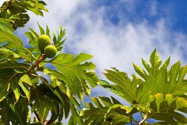 Keywords: fruit food breadfruit ripe tasty green sweet tree tropical exotic foliage production round oval sky