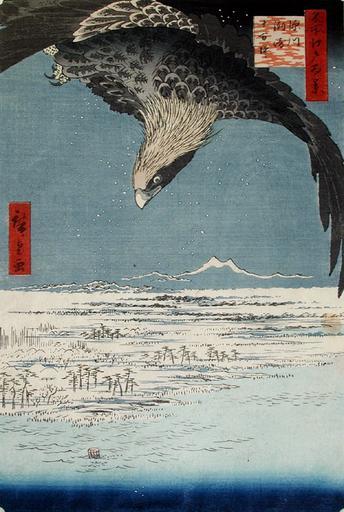 | Keywords: Fukagawa Susaki and Jumantsubo (5759415218).jpg en <b>Accession Number </b> 1957 248 <b>Display Artist </b> Utagawa Hiroshige <b>Display Title </b> Fukagawa Susaki and Jumantsubo <b>Translation s </b> Fukagawa Susaki Juman tsubo <b>Series Title </b> One Hundred Famous Views of Edo <b>Suite Name </b> Meisho Edo hyakkei <b>Creation Date </b> 1857 <b>Medium </b> Woodblock <b>Height </b> 13 5/16 in <b>Width </b> 8 11/16 in <b>Display Dimensions </b> 13 5/16 in x 8 11/16 in 33 81 cm x 22 07 cm <b>Publisher </b> Sakanaya Eikichi Uoei <b>Credit Line </b> Bequest of Mrs Cora Timken Burnett <b>Label Copy </b> In one of the most dramatic scenes of the series a golden eagle swoops down towards a bevy of water birds gathered around a lone bucket floating in Edo Bay This eagle probably refers to the eagle deity Washi Daimy jin whose shrine was located at the site of a winter festival The place names in the title refer to tracts of land Fukagawa Susaki is the name of the promontory which is the vantage point from which this scene is being viewed It is the site of a famous temple to the god Benten who was worshipped for good luck in the New Year J mantsubo which means one hundred thousand tsubo about eighty acres is the name of the reclaimed suburban marshland here shown covered with snow owned by a feudal samurai lord <b>Label Copy Spanish </b> En una de las escenas ms dramticas de la serie el guila dorada se abate sobre una bandada de aves acuticas agrupadas alrededor de una cubeta que flota en la baha de Edo Esta guila probablemente es una referencia a la deidad Washi Daimy jin cuyo santuario est localizado en el sitio de un festival de invierno Los nombres de los lugares en el ttulo se refieren a extensiones de tierra Fukagawa Susaki es el nombre del promontorio de dnde se ve esta escena Es el sitio de un famoso templo al dios Benten quien era adorado para que concediera buena fortuna en el Ao Nuevo J mantsubo que significa cien mil tsubo cerca de treinta hectreas es el nombre de los pantanales recuperados aqu cubiertos de nieve que pertenecen a un seor samurai feudal <b>Collection </b> http //www sdmart org/art/our-collection/asian-art The San Diego Museum of Art 2011-05-25 11 55 10 https //www flickr com/photos/thesandiegomuseumofartcollection/5759415218/ Flickr en thesandiegomuseumofartcollection PD-old-100 Art of Japan in the San Diego Museum of Art |