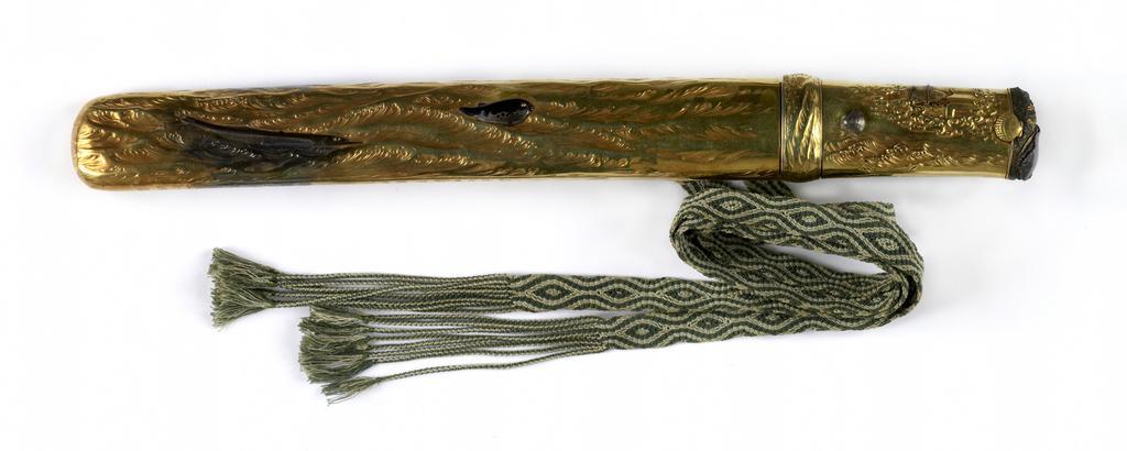 | Keywords: Fukawa Kazunori - Dagger Depicting Tamatori Retrieving the Sacred Jewel from the Sea - Walters 511204 - Back.jpg Walters Art Museum artwork Creator Fukawa Kazunori <br/> Creator Ishiguro Masaaki <br/> 1854 Nambokucho-late Edo steel gold copper copper alloy silver alloy wood textile shakudo shibuichi sentoku mounted blade cm 25 4 l accession number 51 1204 21990 Henry Walters Baltimore date and mode of acquisition unknown Walters Art Museum Henry Walters Acquired by Henry Walters Translation Place Bi only the first kanji remains ; Signature Ishiguro Masaaki; Signature Otsuryuken Miboku; Transcription Oju Kyogaishi Fugawa Kazunori sen Kaei nana Ko-in nen shuban; Translation Carved on special order by Kyogaishi Fugawa Kazunori Kaei 7 1854 late spring; Translation Bishu province place of origin Tokyo Japan Walters Art Museum license Japanese swords and koshirae in the Walters Art Museum White background Koshirae aikuchi tanto Fukawa Kazunori Ishiguro Masaaki Hamano Masanobu |