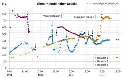 | Keywords: Fukushima I accidents containment pressures.svg bekannten Venting-Startzeitpunkten zwei vermuteten Ventings Datenquelle http //www tepco co jp/en/nu/fukushima-np/index-e html; Höchstdruck 427 MPag 527 MPa bei BWR/3 und BWR/4 laut http //www kantei go jp/foreign/kan/topics/201106/pdf/chapter_iv-2 pdf own PM3 2011-06-07 Cc-zero Data graphs relating to the Fukushima I Nuclear Power Plant SVG charts in German | ||||