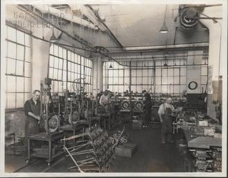| Keywords: kalamazoo public library michigan history photography manufacturing factory workers fuller company automobile assembling transmission monochrome Fuller Manufacturing Company, new assembling line. Original photograph caption reads, "This company is famous for its 'five speeds forward' five speed transmissions. About 1800 transmissions per month are manufactured." Photo shows several unidentified workers. KPL catalogue number P-41. Fuller Manufacturing Company, new assembling line. Original photograph caption reads, "This company is famous for its 'five speeds forward' five speed transmissions. About 1800 transmissions per month are manufactured." Photo shows several unidentified workers. KPL catalogue number P-41. |