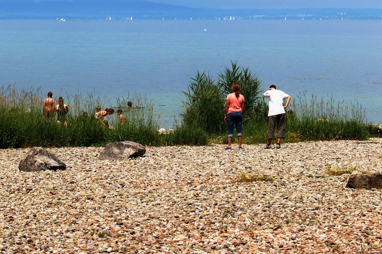 Keywords: fun lake swim children woman man bank stones plant background lake constance arbon