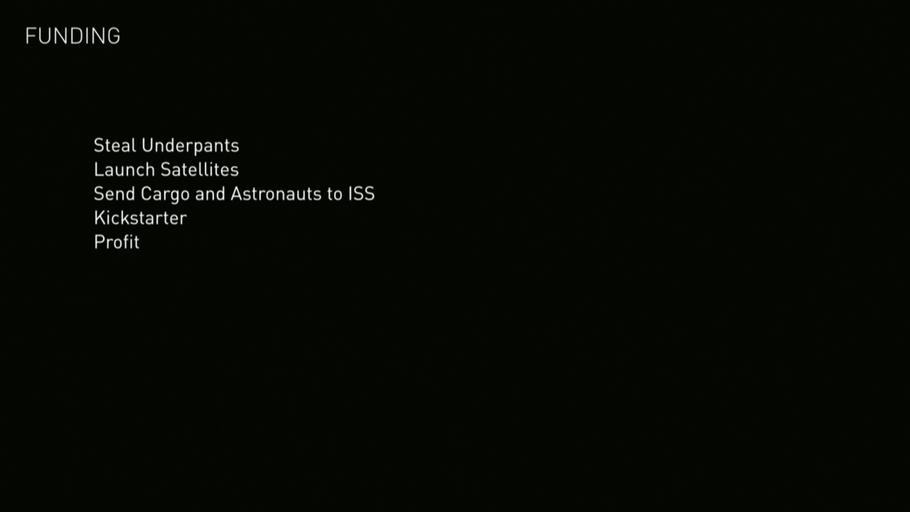 Keywords: spacex elon musk elonmusk mars slide funding steal underpants stealunderpants frame grab framegrab screenshot presentation space exploration spaceexploration monochrome blackandwhite black and white Taken from the 0:44:26 mark in Elon Musk's (SpaceX) presentation on building a transport infrastructure to Mars. Steal Underpants Launch Satellites Send Cargo and Astronauts to ISS Kickstarter Profit View on Know Your Meme Taken from the 0:44:26 mark in Elon Musk's (SpaceX) presentation on building a transport infrastructure to Mars. Steal Underpants Launch Satellites Send Cargo and Astronauts to ISS Kickstarter Profit View on Know Your Meme |