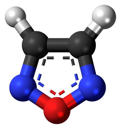 Keywords: Furazan-3D-balls.png Ball-and-stick model of the furazan molecule also known as 1 2 5-oxadiazole a heterocycle and a simple aromatic ring Colour code 505050 Carbon C black<br> F0F0F0 Hydrogen H white<br> F51E1E Oxygen O red<br> 3C50FA Nitrogen N blue<br> 2011-05-31 own DS Visualizer Jynto talk Space-filling version cc-zero Oxadiazoles Simple aromatic rings Images by Jynto Ball-and-stick models |