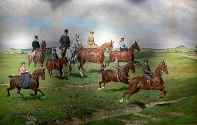 | Keywords: Fürstliche Familie Fürstenberg beim Ausritt im Donauried 1906.jpg artwork Von links nach rechts Prinzessin Anna Netti auf žScherz Stallmeister Howe auf žStrawberry Prinz Karl Friedrich Fritz auf žDaisy Fürst Max Egon II auf žGranit Fürstin Irma auf žMiss Naps Prinz Max Egon auf žCock Robin Prinzessin Leontine Lotte/Lotti auf žCranberry Erbprinz Karl Egon auf žDum-Dum Ganz links der Wartenberg ganz rechts der Fürstenberg oil on canvas 163 x 254 cm Fürstlich Fürstenbergische Sammlungen Donaueschingen own own photograph at exhibition Adel im Wandel Sigmaringen 2006 1906 creator Julius von Blaas Fürstenberg Adelsfamilie Julius von Blaas 1906 paintings Equestrian portrait paintings Photos by User AndreasPraefcke Family portraits Personalities of Wilhelmine Germany |
