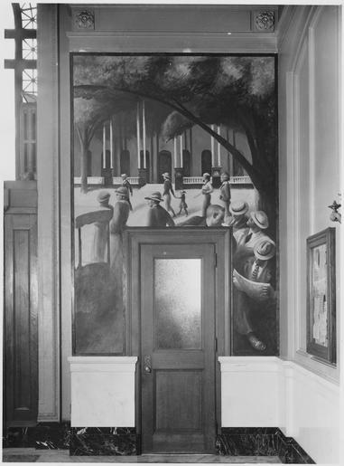 | Keywords: FWA-PBA-Paintings and Sculptures for Public Buildings-Saratoga New York-artist Guy Peine Du Bois-painting of men and... - NARA - 195797.tif Scope and content General notes 195797 Local identifier Roosevelt Franklin D Franklin Delano 1882-1945 Franklin D Roosevelt Library NLFDR 4079 Albany Post Road Hyde Park NY 12538-1999 Mural Saratoga in Racing Season 1937 by Guy Pène du Bois for the United States Post Office Saratoga Springs New York More information at http //livingnewdeal org/projects/post-office-murals-saratoga-springs-ny/ The Living New Deal NARA-cooperation PD-USGov FWA-PBA Paintings and Sculptures for Public Buildings Treasury Relief Art Project Guy Pène du Bois |