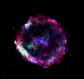 Keywords: G11.2-0.3.jpg en G11 2-0 3 is a circularly symmetric supernova remnant that contains a dense rotating dead star at its center representing a textbook case of what the remnant of an exploding star should look like after a couple thousand years When a massive star collapses the outer layers of the star are blown away in an extremely energetic explosion Depending on the mass of the original star a dense object such as a neutron star or a black hole can form and be left behind at the explosion's center Such a neutron star known as a pulsar when it rapidly rotates can be kicked by the thermonuclear shock wave created when the star exploded causing it to race through space at millions of miles per hour 2006-12-06 08 43 03 http //chandra harvard edu/photo/2007/g11/ X-ray NASA/CXC/Eureka Scientific/M Roberts et al ; Radio NRAO/AUI/NSF PD-USGov Uploaded with UploadWizard G11 2-0 3 |
