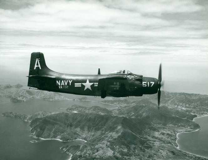 | Keywords: outdoor monochrome 80-G-435040. Douglas AD-2 "Skyraider" attack plane (Bureau # 122343), of Attack Squadron 702 (VA-702) Over the Japanese islands, after being launched on a routine flight from USS Boxer (CV-21) in September 1951. The ship was then en route to the Korean combat area. Official U.S. Navy Photograph, now in the collections of the National Archives. 80-G-435040. Douglas AD-2 "Skyraider" attack plane (Bureau # 122343), of Attack Squadron 702 (VA-702) Over the Japanese islands, after being launched on a routine flight from USS Boxer (CV-21) in September 1951. The ship was then en route to the Korean combat area. Official U.S. Navy Photograph, now in the collections of the National Archives. |