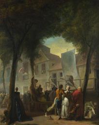 | Keywords: Gabriel-Jacques de Saint-Aubin, A Street Show in Paris, 1760.jpg Artwork en Harlequin and Crispin are seen duelling on a simple stage They are characters from the 'commedia dell'arte' a popular form of comic theatre that originated in Italy Street theatre was popular in 18th-century Paris The trees in this picture form a arch which makes the spectators as much a spectacle as the show itself A picture of approximately the same size 'La Réunion du Boulevard' now at Perpignan may have been intended as a pendant An etching by Duclos of this picture gives the painter and the date 1760 1760 Oil on canvas 80 x 64 1 cm Institution National Gallery London object history exhibition history credit line Bought 1907 http //www nationalgallery org uk/paintings/gabriel-jacques-de-saint-aubin-a-street-show-in-paris National Gallery London accession number NG2129 PD-100 Urban life paintings of Paris Gabriel Jacques de Saint-Aubin French paintings in the National Gallery London 1760 paintings 1760s paintings from France Theatre in art Street theatre in Paris Parade French street entertainment Paris in the 1760s |