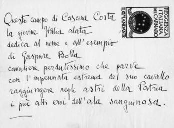 Keywords: Gabriele D'Annunzio epigrafe Gaspare Bolla.jpg en Epigraph in memory of Gaspare Bolla Pieveottoville july 28 1874 Gris july 18 1915 Italian knight and aviator Gaspare Bolla Pieveottoville 28 luglio 1874 Gris 18 luglio 1915 cavaliere ed aviatore italiano http //www aeronautica-cavalleria it/ Maurizio Lanza - Archivio conte Roberto Bolla Gabriele D'Annunzio Pescara 12 marzo 1863 Gardone Riviera 1ΒΊ marzo 1938 1922 Caricata 24 febbraio 2011 PD-old Gabriele D'Annunzio Epigraphs in literature |