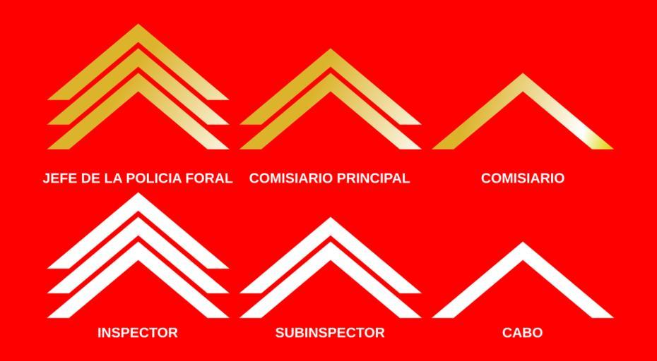| Keywords: Galones de la Policia Foral.svg en Rank insignia of Policia Foral es Divisas de empleo de la Policia Foral de Navarra own EBNZ 2010-01-12 Galones forales png ORDEN FORAL 85/2008 DE 20 DE FEBRERO DEL CONSEJERO DE PRESIDENCIA JUSTICIA E INTERIOR SOBRE UNIFORMIDAD DISTINTIVOS Y CREDENCIALES DE LA POLICÍA FORAL DE NAVARRA Texto publicado en BON N º 40 de 28 de marzo de 2008 - http //www lexnavarra navarra es/detalle asp r 29592 Policía Foral de Navarra | ||||
